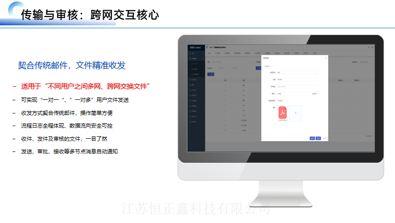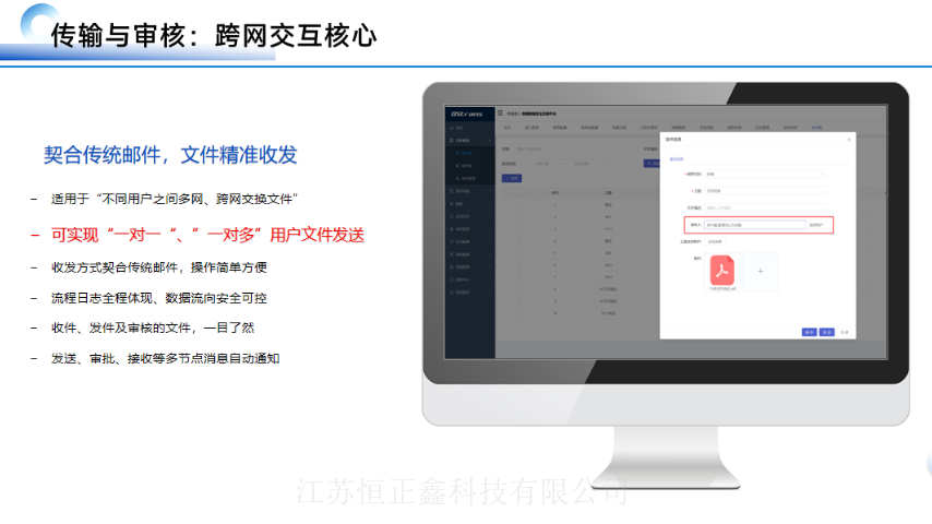 多網(wǎng)文件擺渡系統(tǒng)作為連接不同網(wǎng)絡(luò)空間的關(guān)鍵技術(shù)平臺,承擔(dān)著文件傳輸、管理和**保障的多重職責(zé)。簡單易用的系統(tǒng)設(shè)計注重用戶體驗,界面直觀,操作流程符合用戶習(xí)慣,降低了跨網(wǎng)文件交換的操作難度。系統(tǒng)支持多網(wǎng)絡(luò)環(huán)境,包括內(nèi)網(wǎng)、外網(wǎng)和專線,能夠靈活適配復(fù)雜的網(wǎng)絡(luò)結(jié)構(gòu)。傳輸方式多樣,支持拖拽上傳、批量發(fā)送和定時傳輸,滿足不同業(yè)務(wù)場景的需求。系統(tǒng)內(nèi)嵌傳輸、審核、**、存儲等功能模塊,構(gòu)建完整的文件交換生態(tài)。流程日志記錄全程文件流轉(zhuǎn)軌跡,確保數(shù)據(jù)流向清晰,便于審計和風(fēng)險管控。多節(jié)點消息通知機(jī)制幫助用戶實時了解文件狀態(tài),提升協(xié)作效率。江蘇恒正鑫科技有限公司基于DStrans跨網(wǎng)數(shù)據(jù)**交換平臺,契合傳統(tǒng)郵件操作習(xí)慣,實現(xiàn)文件準(zhǔn)確收發(fā),適用于不同用戶之間多網(wǎng)、跨網(wǎng)交換文件,致力于打造符合行業(yè)需求的多網(wǎng)文件擺渡系統(tǒng)。
